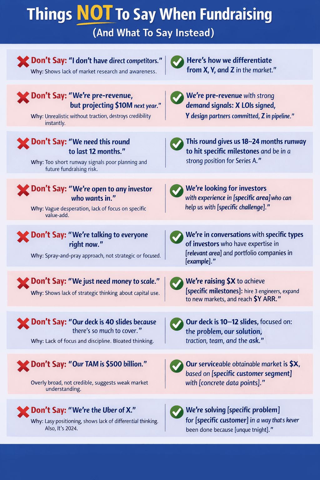 Why it’s a problem: Broadcasting that you’re “talking to everyone” when fundraising signals a spray-and-pray approach. It can make you seem not strategic or focused in your outreach. Top investors want to feel that you chose to approach them for a good reason – whether it’s their background, their portfolio, or alignment with your vision. If you imply that you’re indiscriminately pitching to any and all investors who will listen, it diminishes the sense of opportunity and urgency. It also hints that you may be getting turned down a lot, or that you haven’t identified what kind of investor is the right fit for your startup.